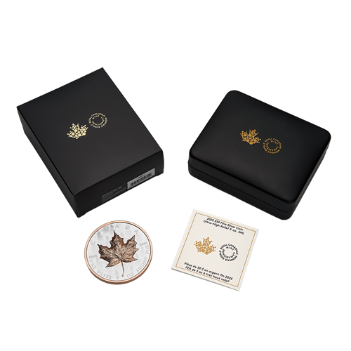 An expression of pride for these incredible landscapes, the Heart of the Forest pulsating field pattern returns in 2025, transporting the viewer into the heart of a misty forest on the reverse of this 5-oz. coin—the largest (65 mm) of our 2025 Ultra-High Relief (UHR) Silver Maple Leaf (SML) and Gold Maple Leaf (GML) coins. The trees fall in and out of view behind the maple leaf struck in Ultra-High Relief (UHR) and highlighted by rose gold plating, which stands in for red, the boldest of Canada’s fall hues and official colours.