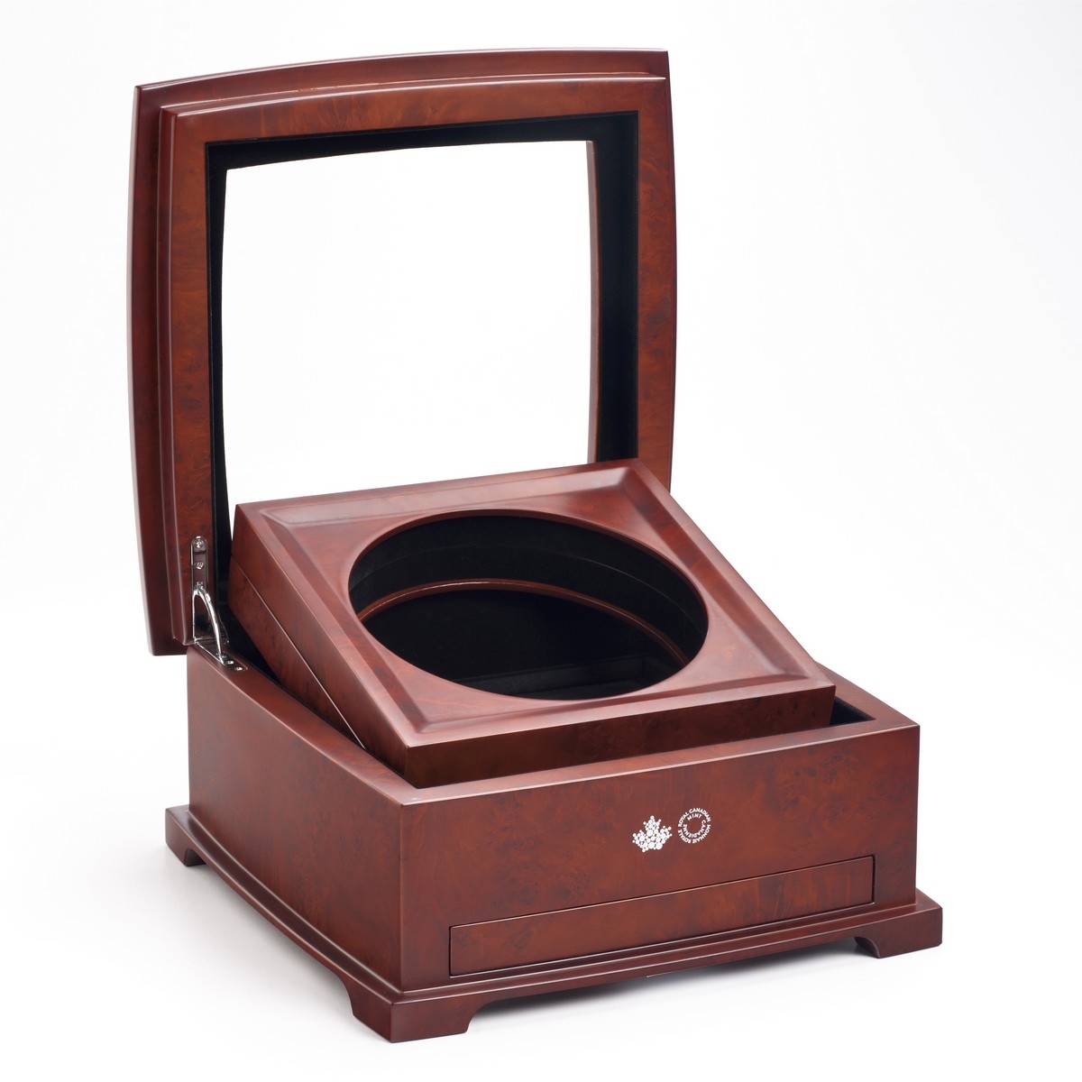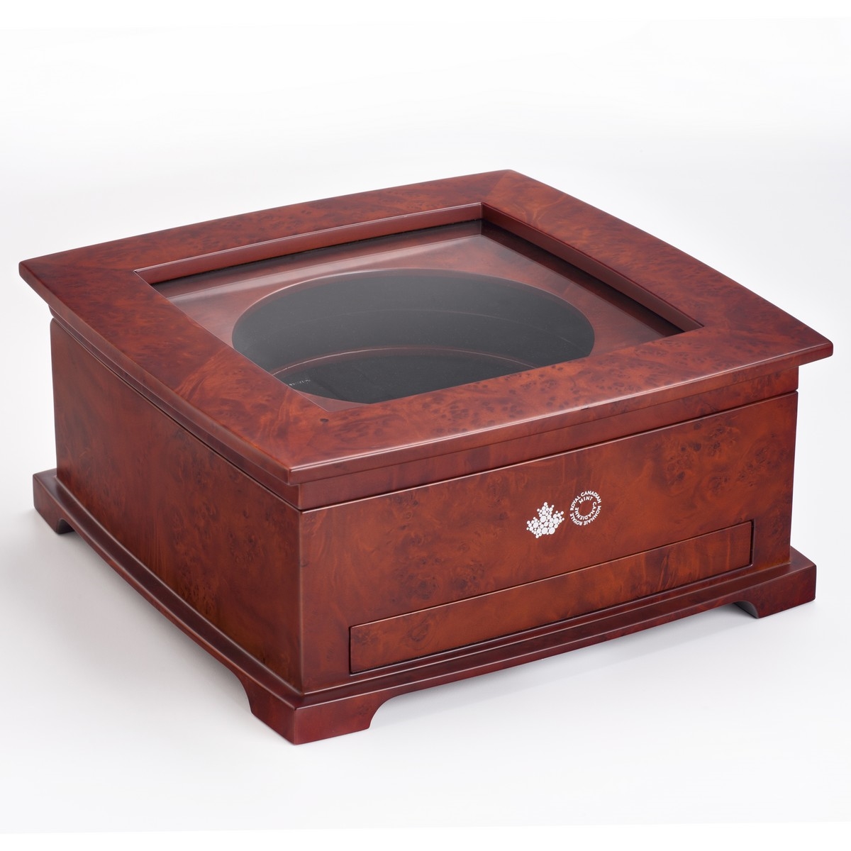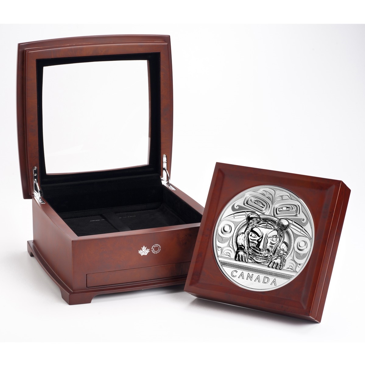 This 500-Dollar coin is 99.99% pure silver with a diameter of 180 millimetres and a metal weight of 5,000 grams. The reverse design features a detailed interpretation by Royal Canadian Mint engravers, in consultation with Haida artist James Hart, of the 1882 Charles Edenshaw argillite box commissioned by Dr.Israel Wood Powell. The image centres on the central figure of the box: a lion with human hair and a humanistic nose and chin. Two human-like hands flank the face, which is encircled as though emerging from a cave. The background features flowing and organic ovoids, u-forms, and other key Haida forms as well as detailed negative space cross-hatching—all characteristic of Edenshaw’s work.
