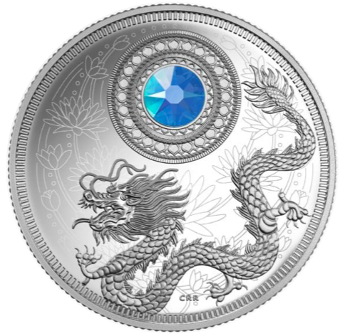 The reverse design by Three Degrees Creative Group is both visually compelling and richly symbolic, with a thoughtful melding of traditional and contemporary design elements. In the background, a beautifully engraved lotus pattern fills the reverse in a modern take on the blooms that traditionally symbolize purity of the heart and mind. A majestic, mid-relief dragon is brought to life through intricate engraving that recreates it in extraordinary detail; its presence also carries a strong meaning, as the dragon is a time-honoured symbol of power, strength and good luck in Asian mythology. Above it, a traditional circular motif bears a Swarovski crystal embellishment that represents aquamarine, the birthstone for March, which is said to bring courage and health to those born in the month. The obverse features the effigy of Her Majesty Queen Elizabeth II by Susanna Blunt.