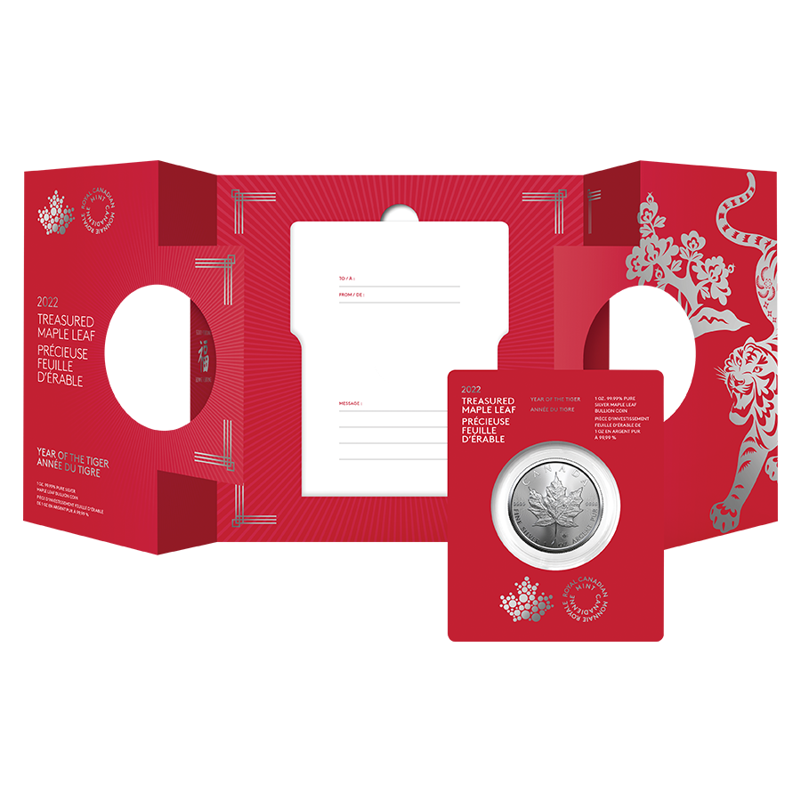 - 2022 1 oz $5 Pure Silver Coin – Treasured Silver Maple Leaf – Year of the Tiger: Witness the artistry of the 2022 1 oz $5 Pure Silver Coin – Treasured Silver Maple Leaf – Year of the Tiger. Crafted with meticulous detail, this coin captures the majestic essence of the elusive tiger, symbolizing power and resilience. The renowned Silver Maple Leaf serves as the canvas for this intricate portrayal, showcasing the tiger’s regal presence amidst a backdrop of delicately engraved leaves. With a weight of 1 ounce and a denomination of $5, this coin marries beauty with investment value, making it a prized addition to any collection.